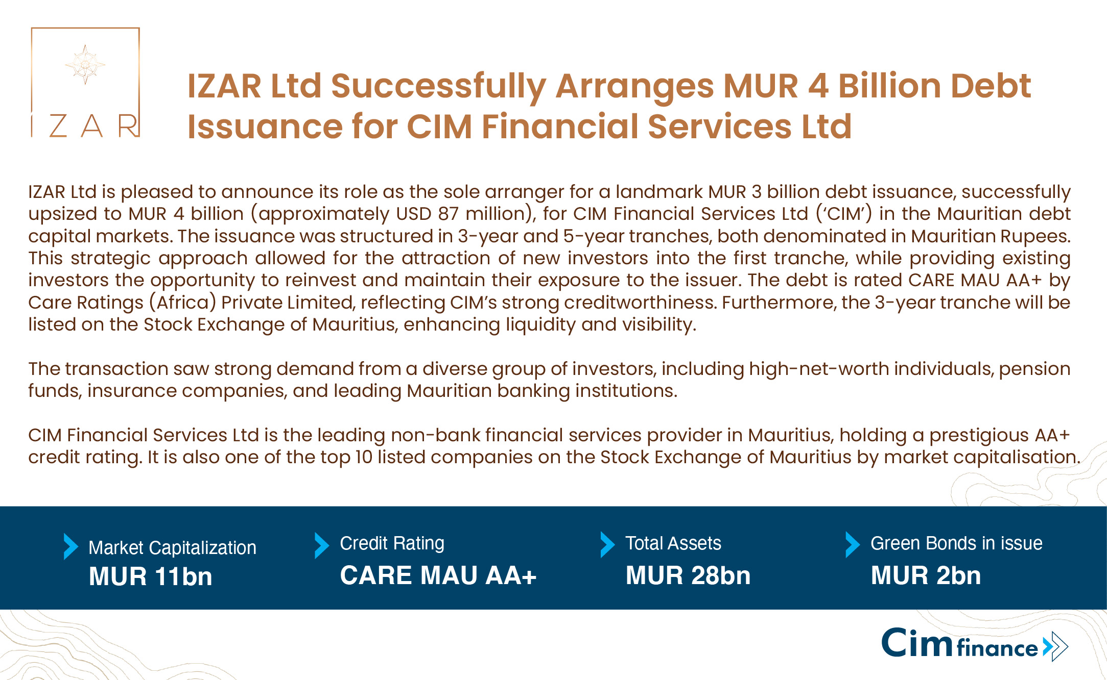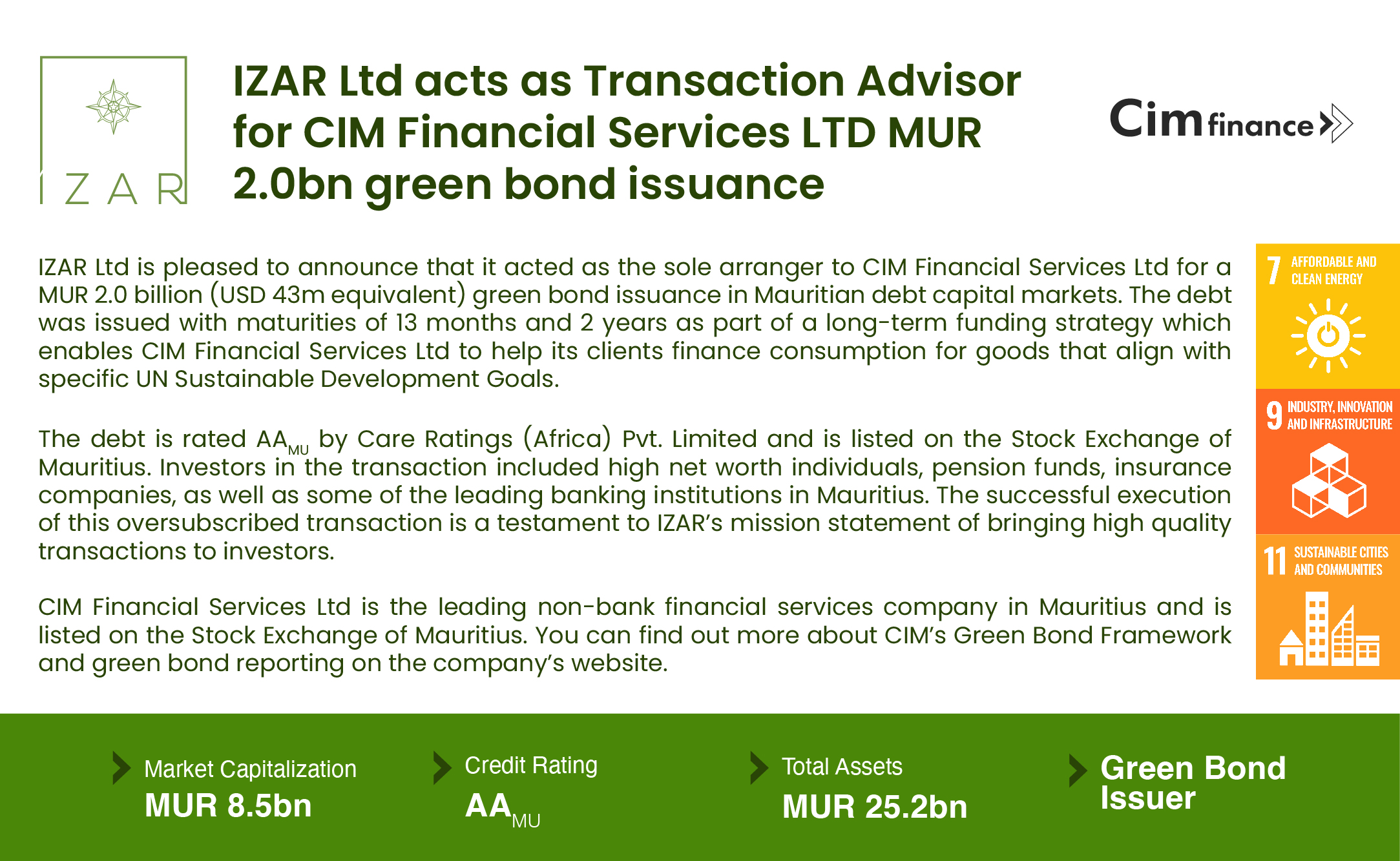 - USD 35 millionIZAR ltd was transaction adviser to CIM Financial Services Ltd on the issuance of a MUR 2 billion issuance of senior unsecured debt